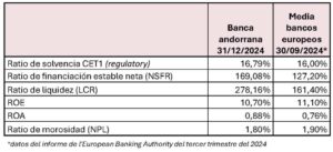 Los datos confirman la solidez del sistema financiero andorrano. A 31 de diciembre de 2024, la ratio de solvencia CET1 se sitúa en el 17%, por encima de la media europea (16%). La ratio de cobertura de liquidez (LCR) es del 278%, muy por encima del mínimo regulador del 100% y de la media europea (161%).